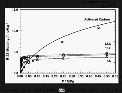 對選自在活性炭上的吸附是典型的I型行為根據(jù)IUPAC分類是完全可逆的。這是比較選自吸附在離子液體中的溶解度和分子篩活性炭相當(dāng)有趣,在我們以前的工作中發(fā)現(xiàn)。在活性炭上的吸附是選自顯著高于在離子液體中的溶解度)。圖1顯示了活性炭在2 MPa和298 K達(dá)到約22.7摩爾公斤−1吸附在離子液體的吸收達(dá)到約2.37摩爾公斤−1在2 MPa和298 K。與離子液體相比,活性炭的吸附量要大一個數(shù)量級。在活性炭吸附選自也比分子篩吸附完全不同。圖2顯示了在低壓力下的吸附選自(P<0.05 MPa)的活性炭是低于5A沸石吸附然而,隨著壓力的增加(0.1 > > >,將13x鈉Na、k-lsx > 5a >活性炭。