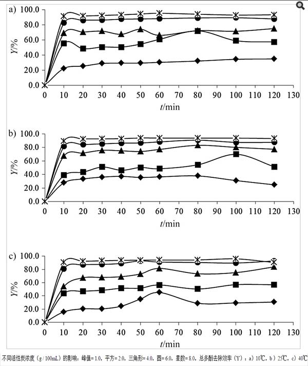 所用活性炭的濃度是控制吸附的重要因素。眾所周知,溫度是影響任何吸附過程的附加因素。因此,在三個(gè)不同的溫度,室溫(25℃),高于(40℃)和波紋管(10℃)下進(jìn)行測(cè)試。為了觀察溫度和吸附劑量對(duì)多酚吸附的同時(shí)影響,吸附劑濃度從1至8g / 100mL變化。使用相同數(shù)量的廢水(25mL)和恒定的酚濃度(3.0mg / mL)進(jìn)行不同的測(cè)試,但改變活性炭的量(0.25、0.5、1.0、1.5和2.0g)。在圖中可以觀察到不同溫度下的吸附趨勢(shì)。