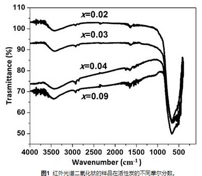 圖1示出了TiO 2的樣品的紅外光譜在活性炭的不同摩爾分數(shù)。對于浸軟的手動獲得的化合物,譜圖顯示在3440cm -1處的譜帶,這與H-OH振動模式應(yīng)力相關(guān)聯(lián),并且透射率或紅外吸收碳隨著濃度的降低而增加。由于活性炭的存在,在2908cm -1處發(fā)現(xiàn)了由于芳香族基團的CH鍵而形成的譜帶,觀察到該譜帶通過降低碳含量而急劇下降。1630cm -1處的帶對應(yīng)于水彎曲模式。具體看1000到400厘米-1寬帶被定義為活性碳含量增加。該區(qū)域的特征譜帶位于680 cm -1處,可與官能團Ti-O-Ti和官能團Ti-O的振動模式相關(guān)聯(lián)。通常,在圖1中觀察到強度隨著活性炭含量的降低而增加,這表明在低的碳摩爾分數(shù)下各種結(jié)合的形成更強。