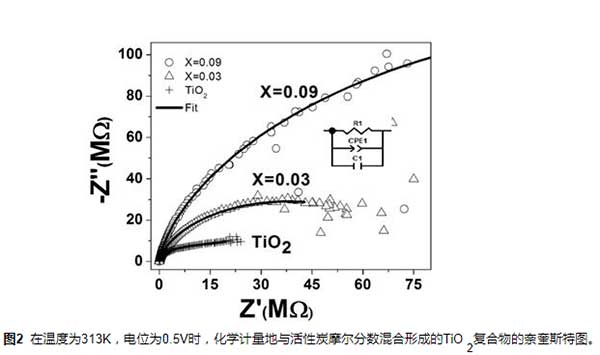 表1化學(xué)計量學(xué)與活性炭摩爾分數(shù)混合的TiO2的等效電路的參數(shù)值,在313K的溫度下獲得。