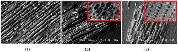 圖中顯示了活性炭和對(duì)比材料的SEM背散射電子圖像(BSI)。可以看出,活性炭其表面上具有排列良好的孔隙。然而,由于高分子量揮發(fā)物的釋放,鋸末的纖維結(jié)構(gòu)在熱解后被改變,這影響了孔的數(shù)量和直徑,觀察到尺寸為9-16μm的較小的孔和尺寸為21-48μm的較大的孔。這也表明,形成了幾個(gè)良好的方向微孔與尖銳和彎曲的邊緣形成?紫堵试黾樱捎谥錍結(jié)構(gòu)與芳族C結(jié)構(gòu)變換。