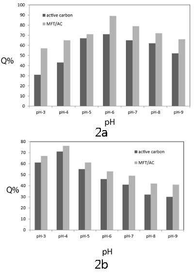 初始pH的影響:初始pH對(duì)鉻和鋅離子的去除效率的影響在pH(3-9)的范圍內(nèi)進(jìn)行研究,并在(圖2a和2b)中表示。通過在含有50mL初始濃度為100mg / L的50mL重金屬溶液的燒杯中,將0.05g MFT/活性炭或活性炭浸泡在25℃下,并且以210KHz聲強(qiáng)度,以7.7W /厘米1小時(shí)。如圖2所示,由于pH影響金屬離子和MFT官能團(tuán)的化學(xué)性質(zhì),MFT / 活性炭從水溶液中去除中的金屬離子是pH依賴性過程。在所有pH值范圍內(nèi),MFT / 活性炭的去除系數(shù)大于活性炭的去除系數(shù)。對(duì)于鉻離子,去除Cr 3+的系數(shù)離子從pH3增加到6,在pH6達(dá)到最大值。在pH = 6時(shí),約91%的鉻離子從溶液中去除。在pH范圍(7 - 9),去除系數(shù)略有下降。對(duì)于鋅離子,去除系數(shù)在pH4時(shí)達(dá)到最大值,鋅離子去除率達(dá)到74%,然后明顯下降。在中性或微酸性介質(zhì)中,吸收可能是由于樹脂 - 金屬離子絡(luò)合物的穩(wěn)定形成,由于配位羧酸根釋放H+,可能導(dǎo)致介質(zhì)酸度增加。在較高的pH值下,重金屬離子將水解成Cr(OH)+和Zn(OH)+,因此,重金屬正電荷減少到+1,這使得與螯合劑的低相互作用除了金屬氫氧化物可以沉淀。