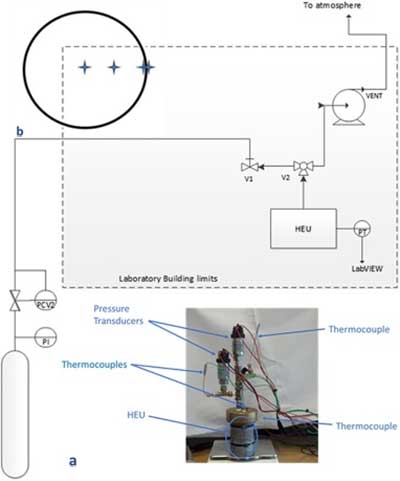 使用設(shè)計(jì)為模擬自冷卻罐的換熱機(jī)組(HEU)為200mL容積的圓柱形容器進(jìn)行實(shí)驗(yàn)。該設(shè)備在圖1中示意性地示出; 參見圖1a中的照片。換熱機(jī)組(HEU)的主體由鋁制成,并用黃銅蓋封閉。水浴也是實(shí)驗(yàn)裝置的一部分。