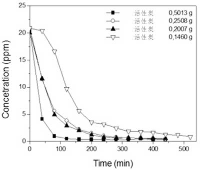 使用不同的質(zhì)量對活性炭的4-硝基酚吸附容量清楚地表明,在較低的質(zhì)量下,以mg g-1表示的吸附容量較高,盡管這是在較高的飽和時間獲得的。這偏離了預期,因為吸附容量應該標準化為每克吸附劑,因此應當獨立于所使用的吸附劑質(zhì)量。這個意想不到的結果主要是由于擴散問題,例如搖動,意味著當降低間歇系統(tǒng)中的擴散阻力時獲得更高的效率,導致4-硝基酚溶液更均勻的分布,同時溶液之間質(zhì)量增加的接觸減少和吸附劑。