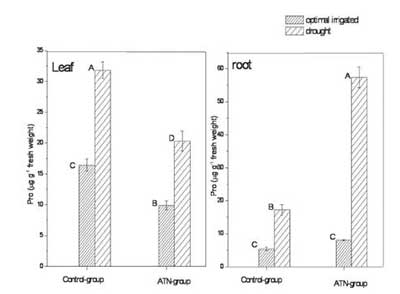 我們在所有檢查組中干旱脅迫條件下脯氨酸含量增加(圖1)。在干旱條件下,與對照組相比,活性炭混合物的存在與葉中脯氨酸含量稍低有關,這表明活性炭混合物在干旱條件下有積極作用。