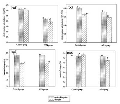 硝酸還原酶(NR)活性水平和兩個組(活性炭和對照)的葉和根中的氮含量如圖2所示。這些結果表明干旱條件誘導了兩個組(對照和活性炭組)的根中的硝酸還原酶活性的顯著降低,以及活性炭混合物組根部中的N吸收降低。