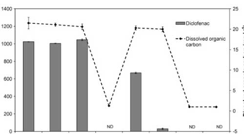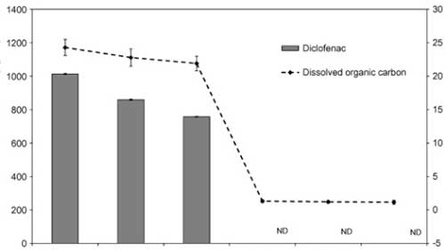 使用活性炭除去雙氯芬酸鈉是定性高效的,通過零吸收和低濃度的DOC的,并且在通過所獲得的色譜中沒有檢測到雙氯芬酸鈉。得在所研究的處理階段中,在活性炭上的吸附導(dǎo)致最顯著的雙氯芬酸鈉去除。因此,雙氯芬酸鈉沒有水樣中的這個階段(LOD之后檢測 = 2 μg L−1)。考慮到所述方法的定量限為3 μg L−1,通過活性炭除去雙氯芬酸鈉的至少99.7%。因?yàn)闆]有研究活性炭的破裂曲線,所以活性炭的結(jié)果可以被認(rèn)為是定性的。然而,為了研究在大型水處理廠中去除雙氯芬酸鈉,必須改進(jìn)該方法以達(dá)到較低的檢測限(約μg L−1)。