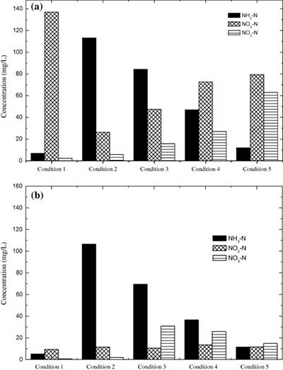 圖2。在條件1-5下短程生物脫氮反應(yīng)器出口的NH 3 -N,NO 2 -N和NO 3 -N濃度對比。(a)好氧隔室和(b)缺氧隔室。