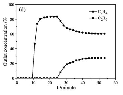 吸附行為通過吸附突破測試來確認。裝載17.44g 36.7%活性炭吸附劑樣品,柱孔隙率為0.56。進料氣體是乙烯/乙烷/氮氣(28:60:12)的混合物,流速為40 mL / min。測量在0.1MPa和25℃下進行。