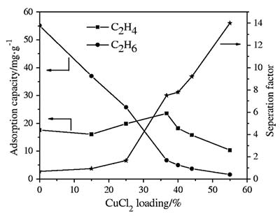 隨著氯化銅含量的增加,活性炭吸附劑上乙烯和乙烷分離的分離因子增加。同時,在氯化銅含量為36.7%時出現(xiàn)乙烯的最大吸附量。很明顯,π-絡(luò)合作用占主導(dǎo)地位。