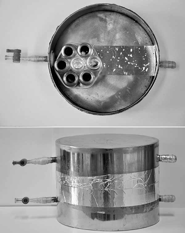 將0.15g活性炭或生物炭稱入20ml透明頂空小瓶中。將三次重復(每次總共6個小瓶)放入容器中。容器由兩個不銹鋼圓柱形盒子構成,每個15厘米內徑和4厘米高(圖1)。將5mL純氯化苦液體注入20ml透明頂空小瓶中并放入容器中以產(chǎn)生飽和蒸氣相。將小瓶放入容器后,用鋁帶密封容器。然后將容器置于溫度穩(wěn)定在30℃的培養(yǎng)箱中。孵育3,6,9,12和24小時后,從培養(yǎng)箱中取出容器。打開容器并在通風櫥中通風約30分鐘。然后使用與已經(jīng)描述的相同的方法分析活性炭炭或生物炭。