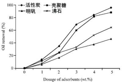 通過改變吸附劑的重量,以100rpm的混合速率,1小時,分析不同吸附劑用量(wt。%)對活性炭與沸石相比對MEA去除殘留油的影響;旌蠒r間,在25-30℃的溫度下接觸時間為1小時。測試在樣品的原始pH下進行,即11.21。在CO 2去除單元系統(tǒng)中根據(jù)需要維持pH水平。圖1顯示了使用活性炭和沸石從MEA廢水中去除殘留油的百分比。從圖1中可以看出觀察到,在最高吸附劑用量(5重量%)下,活性炭與其他物質(zhì)相比顯示出最高的殘油去除率;钚蕴砍晒Τ87%的殘油,沸石為46%。可以得出結論,活性炭最好比其他吸附劑更好地除去殘油。