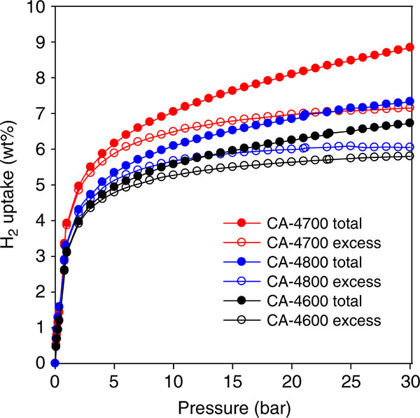 活性炭中的氫儲存需要具有最高表面積和適當尺寸的孔的材料。在-196和25℃下使用重量法在HidenXEMIS分析儀上在0-30巴的壓力范圍內研究活性炭的儲氫能力。圖2顯示了活性炭在-196℃下的過量和總氫吸收等溫線。對于所有CA-4T活性炭,氫吸收是可逆的,沒有滯后現(xiàn)象,并且在0-30巴的壓力范圍內沒有達到飽和。我們首先注意到1巴的氫吸收非常令人印象深刻,在3.1-3.9wt%的范圍內。這種儲氫比為高表面積活性炭傾向于在2-3重量%范圍內的任何報告的值高得多。我們將這種特別高的吸收特性歸因于非常高的微孔表面積和富氧表面的組合,特別是對于3.9重量%的活性炭樣品CA-4700。富氧表面的效果是對于活性炭樣品CA-4600,其盡管具有適度總表面積和微孔表面,仍然表現(xiàn)出的吸收比以前發(fā)現(xiàn)的活性炭材料具有高得多的表面積。經過研究發(fā)現(xiàn),具有氧官能團的活性炭效果預期在低壓下具有最大效果,其中氫和表面之間的相互作用比在較高壓力下更重要,其中通過空間填充機制更可能發(fā)生氫吸收。