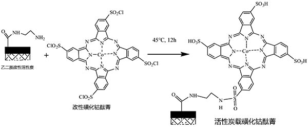 活性炭本身的孔隙結(jié)構(gòu)發(fā)達(dá),擁有大的比表面積和高吸收率與穩(wěn)定性。然而,活性炭按平常的方法浸漬磺化酞菁鈷催化劑會存在負(fù)載型催化劑的活性成分損失的問題,導(dǎo)致再利用性能不令人滿意。因此,應(yīng)通過化學(xué)接枝方法在活性炭上載入CoPcS。