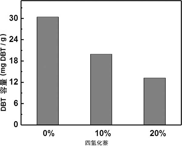 通常,燃料中的芳族分子和含硫化合物阻礙吸附劑向目標(biāo)分子的選擇性吸附。因此,應(yīng)詳細(xì)研究這些化合物的影響,以實(shí)現(xiàn)深度脫硫。因?yàn)榉枷阕宸肿犹烊淮嬖谟谌剂现,所以在芳香族分子共存的情況下有效去除DBT是一個(gè)迫切的問題。通過(guò)活性炭研究了在四氫化萘存在下DBT的吸附去除。圖4表明通過(guò)增加四氫萘的比例可以降低吸附容量,這可能是因?yàn)镈BT和四氫萘在吸附過(guò)程中相互競(jìng)爭(zhēng)。當(dāng)四氫萘的百分比達(dá)到10%時(shí),觀察到DBT吸附容量從30.42下降到19.94mg DBT/g,當(dāng)四氫萘的比例從10%增加到20%時(shí),DBT吸附量下降相對(duì)較慢。觀察到19.94至13.25mg DBT/g。這種抗干擾現(xiàn)象優(yōu)于報(bào)道的使用氮化硼作為吸附劑的結(jié)果,其中在干擾物質(zhì)存在下DBT吸附性能降低了23%。在四氫化萘存在下降低的吸附容量可歸因于四氫化萘易于與活性炭中的碳平面形成π-π相互作用。