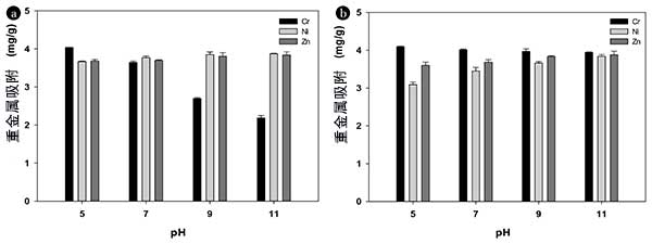 圖3:初始pH對(duì)Cr,Ni和Zn的吸附去除的影響使用。
