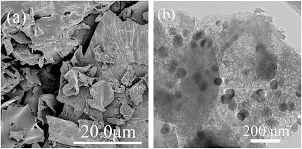 圖1:活性炭(a)的掃描電子顯微鏡形態(tài)和納米零價鐵負載活性炭的透射電子顯微鏡圖像(b)。
