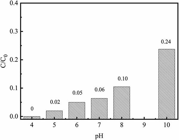 初始pH對鉻酸鹽去除能力的影響如圖3所示。發(fā)現鉻酸鹽的去除能力明顯受pH值在4.0-10.0范圍內的影響。隨著溶液pH從4增加到10,鉻酸鹽去除率從100%下降到76%。在pH~4.0時,HCrO 4是鉻酸鹽的主要形式。因此,在高溶液的pH值,使Cr之間的強烈競爭羥基(OH)應該是低鉻酸鹽去除能力的主要原因。此外,較低的pH可有助于去除無源氧化鐵層,活性炭復合材料的表面中含有納米零價鐵用于接觸周圍的Cr(vi)溶液。因此,在所有后續(xù)的程序將Cr溶液的初始pH設定為4.0。