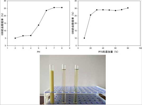 在活性炭負(fù)載鐵離子的初級絮凝預(yù)處理后,濾液含有少量雜質(zhì)。研究了PFS絮凝劑對過濾廢物的影響。使用單因素實(shí)驗(yàn)選擇pH值和PFS添加量(圖3a,b)。原始溶液與初級和次級絮凝后的溶液的視覺比較顯示在圖3c中。