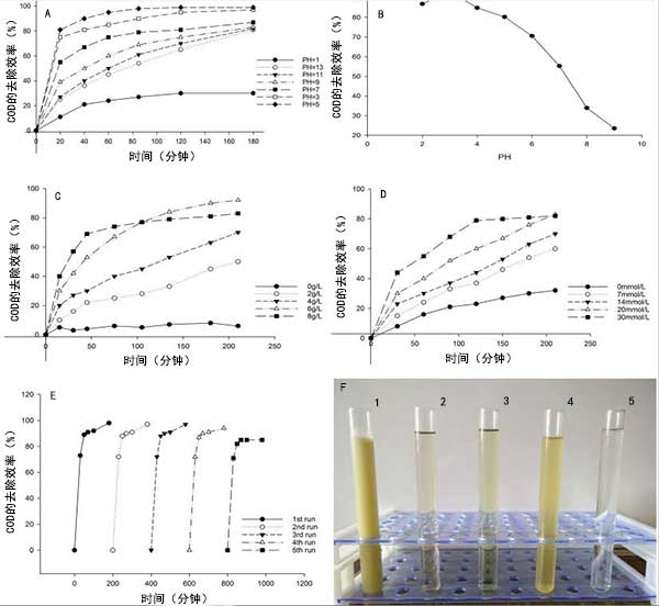 圖4中(a)pH對使用活性炭去除COD的速率的影響,(b)pH對使用傳統(tǒng)方法去除COD的速率的影響,(c)活性炭添加對去除COD的影響,(d)添加H 2 O 2對COD去除率的影響,(e)活性炭在多次運(yùn)行中的性能,(f)實(shí)物圖片中(1)未處理的切削液,(2)初次絮凝后的混合物,(3)二次絮凝后的混合物,(4)傳統(tǒng)處理后的混合物,和(5)活性炭處理后的混合物。