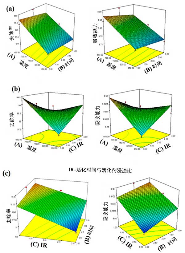 圖1:活性炭的(a)活化溫度和浸漬比(b)活化溫度和活化時間(c)浸漬比和活化時間,去除率和吸附能力對表面響應(yīng)曲線的影響。