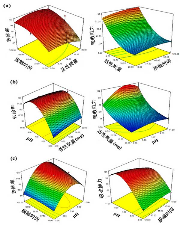 圖3:表面響應(yīng)圖吸附參數(shù)對去除和吸收能力的影響(a)活性炭劑量與接觸時間的相互作用;(b)活性炭與pH之間的相互作用;(c)相互作用pH值與接觸時間。