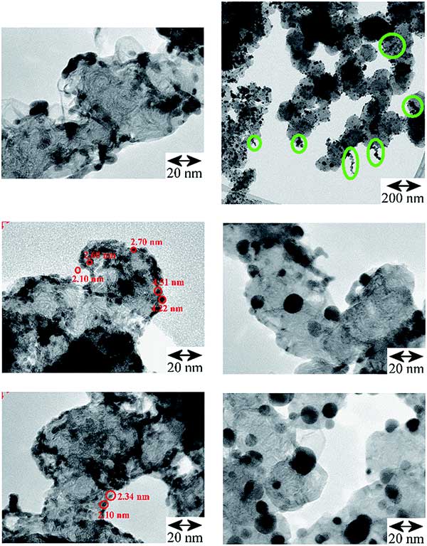 活性炭負(fù)載鈀催化劑的TEM比較顯示在圖1。左:原始活性炭,右頂部和中部:在300°C和底部:400°C下進(jìn)行碳熱處理后,這會(huì)導(dǎo)致活性炭的顆粒增長,但之后聚集體大部分缺失孤立的較大平均尺寸增大的鈀微晶留在活性炭表面。右上:在300℃處理后的活性炭負(fù)載鈀的調(diào)查圖像,其中的橢圓形綠色標(biāo)記突出顯示在400℃催化劑上不存在的殘余聚集體。顯示貴金屬實(shí)體的形狀,尺寸和形態(tài)之間的明顯差異。對于活性炭負(fù)載鈀,在多孔高表面積活性炭載體上/中存在大部分分離的初級顆粒。對于活性炭催化劑,主要存在線性聚集鏈和支化聚集體,在表面具有一些聚集體。熱處理導(dǎo)致大部分分離的初級顆粒尺寸增大,僅剩下少量聚集體或附聚物。
