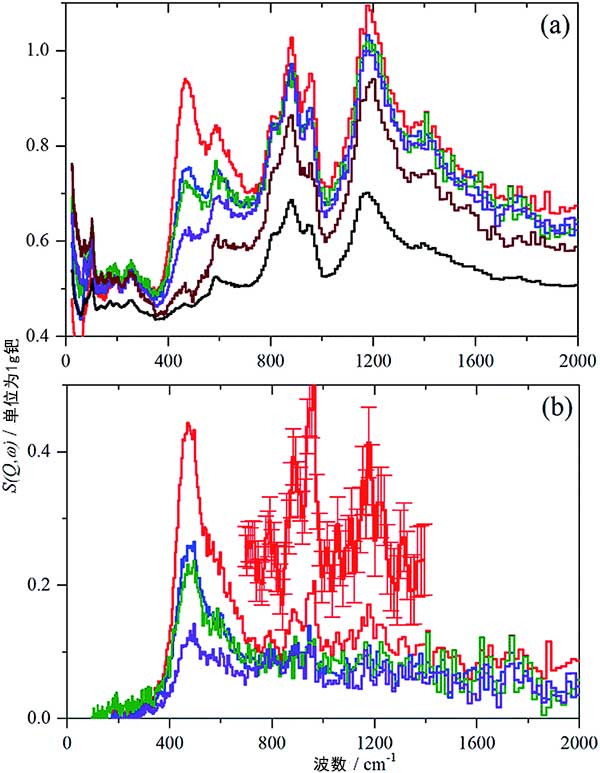 對于活性炭樣品中的每一個(gè),氫氣在飽和壓力(700毫巴)下記錄IINS光譜,然后逐漸使每個(gè)活性炭脫氫,首先使其在室溫下脫氣不同時(shí)間并且然后在200°C下放置12小時(shí)。圖2顯示了標(biāo)準(zhǔn)化光譜活性炭和活性炭負(fù)載鈀的差異光譜,(a)記錄的標(biāo)準(zhǔn)化光譜,氫氣從上到下在700毫巴下,抽真空至9毫巴,抽空至3毫巴,在200℃下抽真空放置12小時(shí),在200℃下第二次抽真空后放置12小時(shí)的活性炭。(b)減去在200℃下第二次抽空過夜的樣品后的差異光譜,從上到下:氫氣在700毫巴下,抽真空至9毫巴,抽真空至3毫巴,在200℃抽真空放置12小時(shí)后的活性炭負(fù)載鈀催化劑。