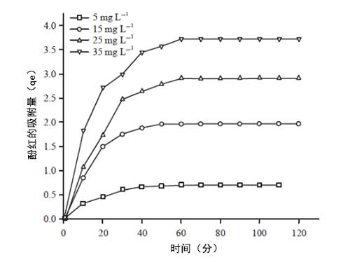 影響酚紅初始濃度的影響:q e(每克吸附劑吸附的酚紅量)(mg g-1)與接觸時間(min)的關(guān)系,使用不同的初始濃度(5-35mg)在給定的吸附劑量(5g L-1)和pH(2.0)下,L-1的酚紅顯示在圖3中。由于吸附-解吸平衡,每個圖表顯示吸附隨接觸時間的初始增加,然后在特征接觸時間達(dá)到飽和,表明在研究活性炭上酚紅的單層覆蓋。吸附的染料量和達(dá)到吸附平衡所需的時間隨著底物(染料)初始濃度的增加而增加。很明顯,因為在較高的染料初始濃度下,活性炭表面上相互作用的吸附分子的數(shù)量變得更高。