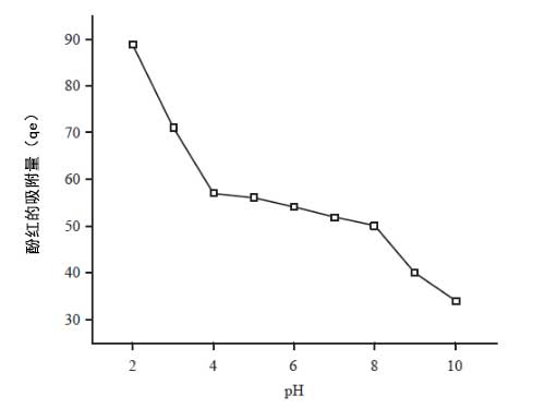 pH對吸附的影響:由于氫和氫氧根離子通常在活性炭表面上非常強(qiáng)烈地吸附,因此其他離子的吸附也受到溶液pH的影響。pH也影響染料的離子化程度以及吸附劑的表面性質(zhì)。作為pH的函數(shù)的活性炭中酚紅染料的百分比吸附的圖示于圖4中。觀察到(a)染料的吸附在2至4的范圍內(nèi)迅速降低。(b)在4-8的pH范圍內(nèi)吸附的減少變慢,和(c)在pH8-10的吸附下急劇下降。在研究的活性炭上染料吸附的這種獨特的pH依賴性變化可能是由于吸附物的復(fù)雜性質(zhì)以及吸附劑在不同介質(zhì)pH下的凈電荷變化。