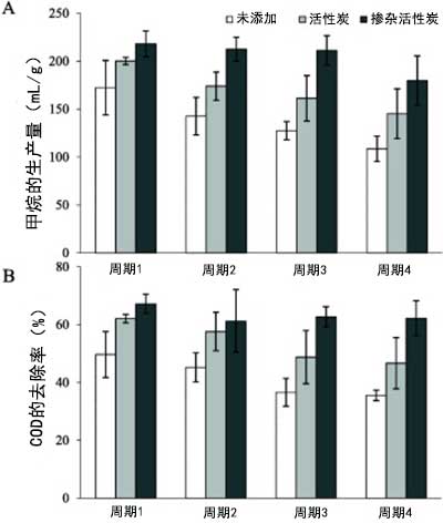 圖2:(A)四個連續(xù)活性炭補料分批循環(huán)中的平均特定甲烷產量和(B)COD去除效率。