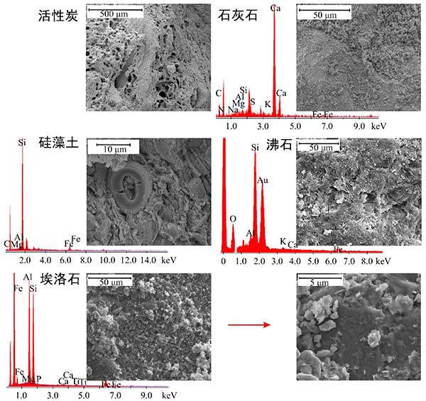 掃描電子顯微鏡(SEM)圖像和反應(yīng)材料的化學(xué)微范圍分析(EDS)如圖2所示。值得注意的是,活性炭樣品具有大膨脹的多孔表面,內(nèi)部孔隙的尺寸達(dá)到十幾微米到幾百微米。石灰石砂的SEM分析證實(shí)了這種材料的碳酸鹽特征,而鈣和氧的微區(qū)化學(xué)分析指向方解石(CaCO 3))。SEM-EDS分析表明硅藻土樣品中存在來(lái)自二氧化硅基團(tuán)的礦物,并允許將該材料的巖相分類(lèi)為硅藻土。SEM微圖像證實(shí)了中等發(fā)展的沸石和埃洛石的表面,并且在后一種材料的情況下,存在特征性的納米管,然而,在該放大率下不是非常明顯。此外,EDS光譜指出沸石樣品中存在:硅(Si),氧(O),鋁(Al),鉀(K),鈣(Ca)和鐵(Fe),以及:鐵(Fe) ,埃洛石樣品中的鋁(Al),硅(Si),鎂(Mg),磷(P),鈣(Ca)和鈦(Ti)。