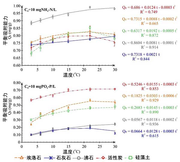 銨和磷酸根離子的平衡試驗(yàn)僅在3℃至22℃的溫度范圍內(nèi)進(jìn)行,因此,吸附容量和溫度的關(guān)系沒(méi)有用多項(xiàng)式函數(shù)描述。類(lèi)似地,如在系列I的分析中,活性炭對(duì)除去銨離子效果比較好,在磷酸鹽的情況下,具有高去除能力的材料是活性炭。
