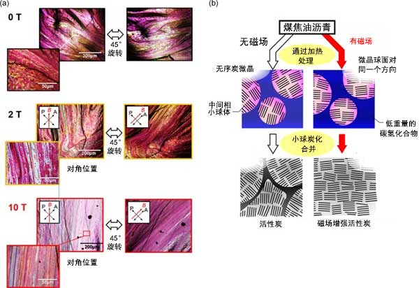 圖2:(a)在沒有和存在2T和10T的磁場的情況下制備的活性炭前體材料的偏振顯微鏡圖像。(b)對(duì)煤焦油瀝青的碳化過程的磁場效應(yīng)的示意圖。