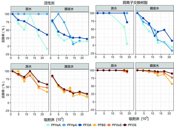 實驗總計進行了12周,每兩周取樣。這導致所有活性炭色譜柱的實驗運行時間為24個,分別處理原水和膜廢水的陰離子交換樹脂色譜柱。在每次采樣之后每周對所有柱進行反洗,以模擬典型的全尺寸操作?偣卜治隽15種全氟烷基物質(zhì),將吸附材料相對于全氟烷基物質(zhì)去除的性能與柱吸附模型的性能進行了比較。