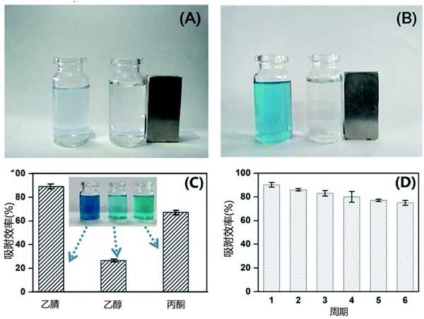 活性炭的回收和再利用是在實際應用中需要考慮的關(guān)鍵因素。因此,我們調(diào)查了活性炭的恢復和可重用性。通過外部磁體很容易將活性炭與水溶液分離(圖3A和B)。通過使用乙腈,乙醇和丙酮作為洗脫液輔助超聲來再生裝載孔雀石綠的活性炭。乙腈的解吸效率優(yōu)于乙醇和丙酮,解吸效率分別為90.2%,35.7%和71.3%(見圖3C);钚蕴吭诮馕驮偕笫欠(wěn)定的。此外,六個循環(huán)后沒有明顯的吸附效率損失(圖3D)。對活性炭的快速吸附,大吸附容量和良好的可重復使用性促使我們研究其實際應用。將活性炭分散在含有加標孔雀石綠(25mg L-1)的廢水中。在用外部磁體快速吸附和分離活性炭后獲得澄清的上清液(圖3A和B)。結(jié)果表明,活性炭是一種經(jīng)濟有效的高性能吸附劑,用于孔雀石綠吸附和去除廢水。