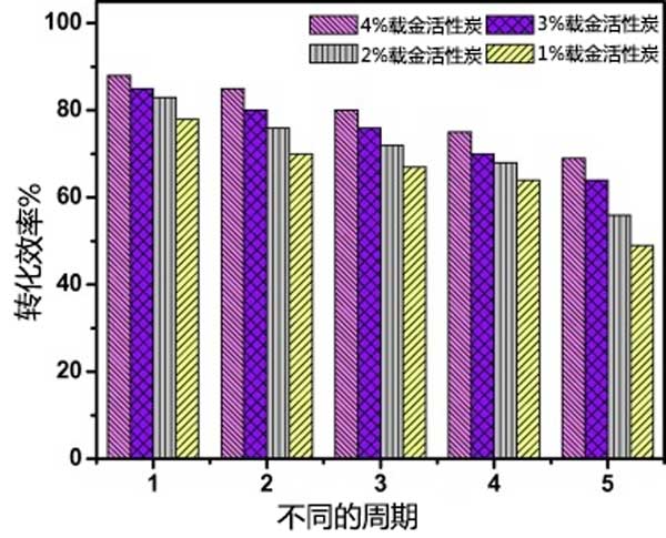 為了量化活性炭載金催化劑的催化活性,可以使用轉(zhuǎn)換頻率作為度量。轉(zhuǎn)換頻率可以定義為使用每克活性炭每單位時(shí)間轉(zhuǎn)化成產(chǎn)物(對(duì)氨基苯酚)的反應(yīng)物分子(對(duì)硝基苯酚)的數(shù)量。活性炭載金催化劑是可回收的,每次運(yùn)行后,通過離心分離催化劑。即使使用5次,催化劑的轉(zhuǎn)化率最多降10%。這通過繪制百分比轉(zhuǎn)換效率與循環(huán)次數(shù)來顯示,如圖3示。