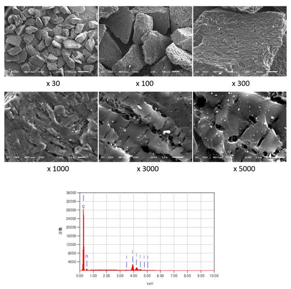 圖1顯示了碘浸漬活性炭的SEM圖像。生產(chǎn)過程不影響活性炭的表面,并且在浸漬過程之前比較碘浸漬活性炭和活性炭沒有觀察到表面差異。EDS結(jié)果顯示顆粒上存在碘,證實(shí)了浸漬的成功。