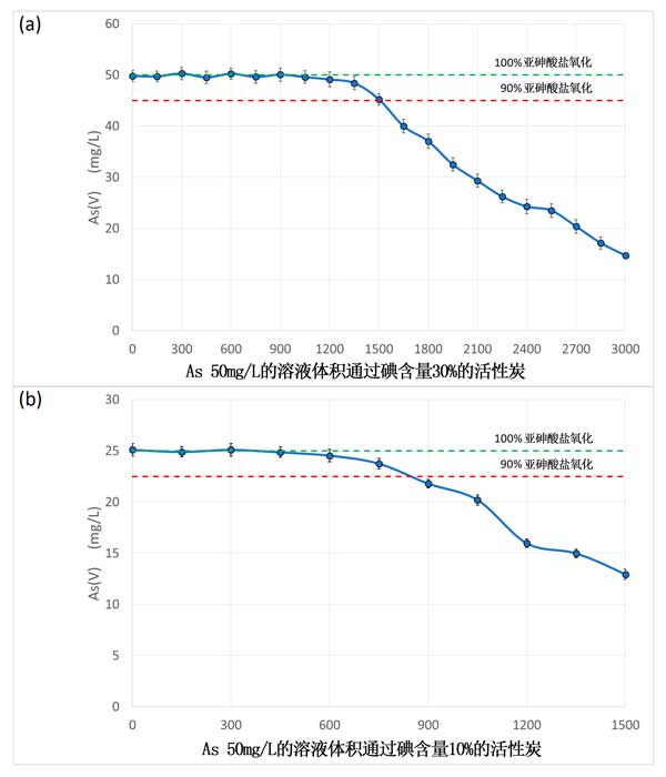 我們的柱實(shí)驗(yàn)可以被認(rèn)為是一種壓力測試,因?yàn)閬喩樗猁}的含量遠(yuǎn)遠(yuǎn)高于天然水中常見的濃度。也使用如此高的濃度以不過度延長實(shí)驗(yàn)時間。在基于蒸餾水的實(shí)驗(yàn)中,并且使用碘浸漬活性炭,測得砷的氧化效率大于90%直至1.5L被氧化,并且在對于1cc碘浸漬活性炭,氧化能力為約25mg砷。之后,氧化效率逐漸降低,在2.5L左右下降至低于50%(圖3a)。