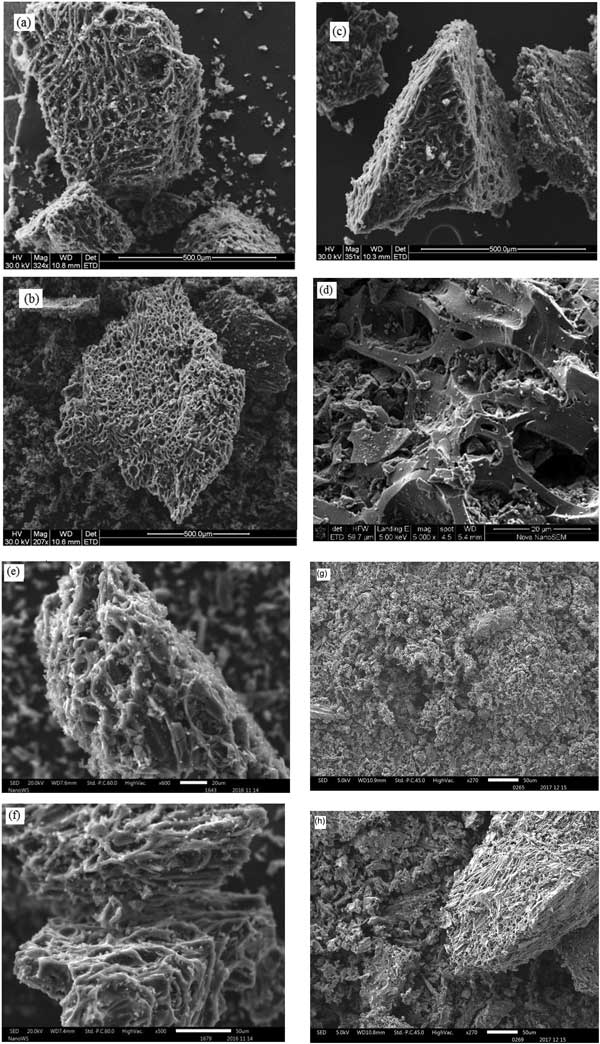 掃描電子顯微鏡圖像顯示在圖1a-h中;钚蕴康牧姿崽幚韺(dǎo)致具有可見孔隙率的材料(圖1a-c)。然而,仔細(xì)觀察后,孔隙結(jié)構(gòu)和尺寸是不同的。20%濃度改性后的活性炭具有稍微細(xì)長的孔,40%表現(xiàn)出均勻的圓形孔,而60%顯示出細(xì)長和圓形毛孔的混合。這些觀察結(jié)果表明,不同濃度的磷酸活化的活性炭具有不同的物理屬性。在這種情況下,磷酸是活化劑,并且在加熱時產(chǎn)生孔道,因為它從碳中逸出,從而帶走一些萃取劑。圖1d描繪了具有小孔的粗糙紋理,圖1e顯示了類似巢的類型的孔,圖1f顯示了孔的破壞和變寬?捉Y(jié)構(gòu)和孔體積的變化可歸因于活化劑的強(qiáng)度增加。濃度較高的硝酸會破壞表面基團(tuán)。因此,需要使用最佳濃度的活化劑來防止損害吸附劑的表面特性。濃度太高可能導(dǎo)致結(jié)合官能團(tuán)的提取,使吸附劑吸附性差。