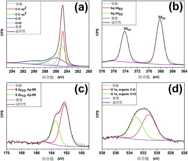 圖2顯示了所制備的活性炭樣品的組成元素的XPS光譜。XPS測(cè)量圖顯示碳,銀,硫和氧作為構(gòu)成元素的存在。S 1p光譜配有多個(gè)高斯分量,這些物種通常存在于活性炭表面上。圖2(b)分別顯示了多個(gè)峰,它們與零價(jià)態(tài)的銀原子一致。S 2p光譜的高分辨率光譜的反卷積,如圖2(c)所示,顯示兩個(gè)自旋軌道分裂為〜1.2 eV的峰。O 1s光譜顯示出不對(duì)稱(chēng)的曲線,表明活性炭表面存在多種氧物質(zhì)(圖2d)。光譜的反卷積產(chǎn)生兩個(gè),其可分別歸因于活性炭表面的C-O和C O物質(zhì),因此不存在金屬氧化物物質(zhì)?傊,XPS結(jié)果表明硫醇鹽配體保持附著在銀簇表面的表面上,并且在活性炭樣品中不發(fā)生銀原子的氧化。