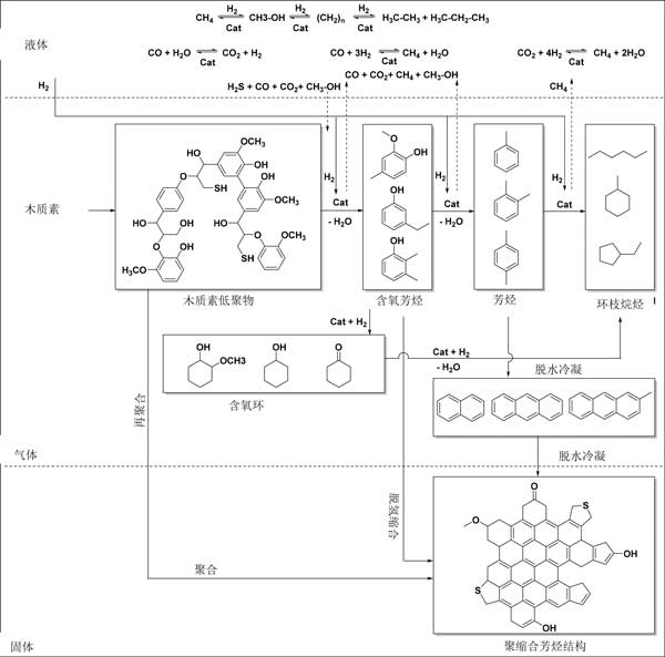 基于木質(zhì)素油的產(chǎn)物產(chǎn)率和組成,提出了一種用于加氫處理的反應(yīng)過程。木質(zhì)素使用活性炭催化劑和氫氣(圖3)。它涉及在液相和氣相中發(fā)生的許多連續(xù)和平行反應(yīng)。對低分子量烷基酚類和芳族化合物的所需反應(yīng)涉及通過裂解鍵來對木質(zhì)素進行熱和催化解聚(加氫裂化)。最具反應(yīng)性的連接是醚鍵,盡管這些在木質(zhì)素中不是很豐富。活性炭催化劑促進解聚反應(yīng),但在不存在活性炭催化劑的情況下的反應(yīng)也產(chǎn)生(有限)量的木質(zhì)素油,表明熱解聚反應(yīng)也起作用。低聚物片段可以進一步解聚成烷基酚類形式的低分子量化合物或再聚合(也與已形成的低分子量化合物一起)成更高濃度的結(jié)構(gòu),最終導致燒焦。后一種途徑可能是熱反應(yīng),因此可以通過使用非;顫姷幕钚蕴看呋瘎﹣硪种,所述催化劑通過催化隨后的轉(zhuǎn)化來減少活性中間體的量。中間低分子量烷基酚類在反應(yīng)條件下不是惰性的,并且可以進一步加氫脫氧成芳族化合物和烷烴。