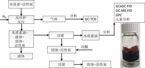 所有活性炭催化加氫處理反應(yīng)均在間歇式高壓釜中進行。反應(yīng)器被鋁塊包圍,該鋁塊包含電加熱元件和允許冷卻水流動的通道。使用氣體誘導的渦輪機機械攪拌反應(yīng)器內(nèi)容物。在線監(jiān)測反應(yīng)器中的溫度和壓力并記錄在電腦上。加氫處理和后處理程序示意性地顯示在圖1中。最初,向反應(yīng)器中加入木質(zhì)素和活性炭催化劑。隨后,用氫氣沖洗反應(yīng)器以排出空氣并在室溫下加壓至120巴以進行泄漏測試。泄漏測試后,壓力降至100巴。開始攪拌(1200rpm),并以約10℃每分鐘的加熱速率將反應(yīng)器內(nèi)容物加熱至所需溫度(400-500℃)。當達到所需溫度時,將反應(yīng)時間設(shè)定為零。反應(yīng)完成后,將反應(yīng)器以約10℃每分鐘的速率冷卻至室溫。記錄室溫下的壓力以確定反應(yīng)過程中產(chǎn)生的氣相組分的量。將產(chǎn)生的氣體收集在氣袋中以確定組成。對于所有反應(yīng),觀察到兩個單獨的液相的清晰形成即即。產(chǎn)品處理程序如圖1所示。反應(yīng)后,將有機相和水相通過微過濾器過濾并通過傾析分離。用丙酮徹底洗滌固體并干燥以確定固體產(chǎn)率。