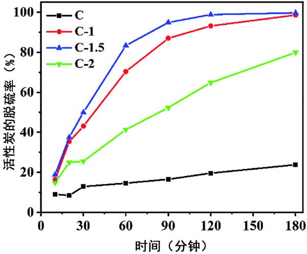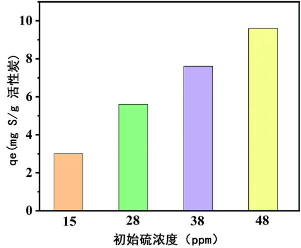 基于以上結(jié)構(gòu)表征和實(shí)驗(yàn)結(jié)果,得出了吸附機(jī)理。戊硫醇分子中的強(qiáng)路易斯酸S原子與活性炭中來(lái)自氧原子的一對(duì)電子相互作用。大孔和中孔的存在有助于活性炭的比表面積增加,暴露出更多的內(nèi)部原子,并促進(jìn)了質(zhì)量傳遞,從而使吸附劑易于與硫化物接觸。關(guān)于炭1.5的工業(yè)應(yīng)用前景,考慮了硫的初始濃度對(duì)吸附性能的影響。如圖3所示,對(duì)于初始含硫量分別為15、28、38和48 ppm的模型燃料,炭1.5的平衡吸附容量為每克吸附劑3.0、5.6、7.6和9.6 mgS。值得注意的是,在此濃度范圍內(nèi),吸附劑的硫去除率高于97%。這組結(jié)果表明該材料對(duì)于去除低濃度的硫化物具有明顯的工業(yè)應(yīng)用價(jià)值。
