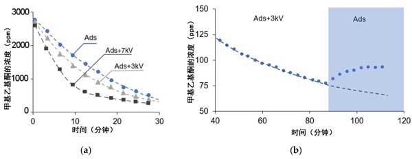 圖4:(a)在不存在和存在電場(chǎng)的情況下,甲基乙基酮的濃度。(b)在先打開然后關(guān)閉電場(chǎng)的測(cè)試中,甲基乙基酮濃度。