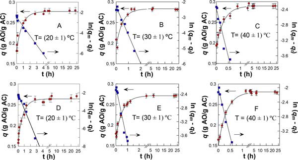 圖1顯示了典型的動力學(xué)圖,說明了沒食子酸和沒食子酸丙酯在平衡(q)時(shí)每質(zhì)量活性炭吸附的抗氧化劑的量隨時(shí)間的變化。還顯示了在不同溫度下至少三個(gè)半衰期(相關(guān)系數(shù)>0.99)的相應(yīng)一階圖。在所有情況下,吸附曲線均顯示在4h后達(dá)到平衡,并至少維持24h,這是后續(xù)研究的時(shí)間。