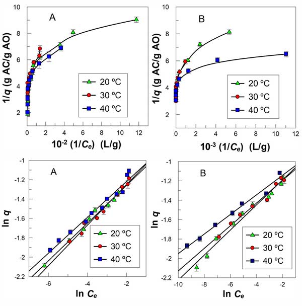 在不同的活性炭量下,評估了溫度(T=20–40°C)對沒食子酸和沒食子酸丙酯吸附過程的影響。實(shí)驗(yàn)吸附平衡數(shù)據(jù)擬合到兩個(gè)等溫線模型,Langmuir和Freundlich方程,并評估了擬合優(yōu)度。圖2。在研究的交流范圍內(nèi)獲得了非線性圖。因此,結(jié)果表明該模型不適用于描述沒食子酸和沒食子酸丙酯在活性炭上的吸附。注意,在任何給定的活性炭質(zhì)量下,溫度的變化都會導(dǎo)致沒食子酸和沒食子酸丙酯的吸附能力發(fā)生非常小的變化,差異小于2%。