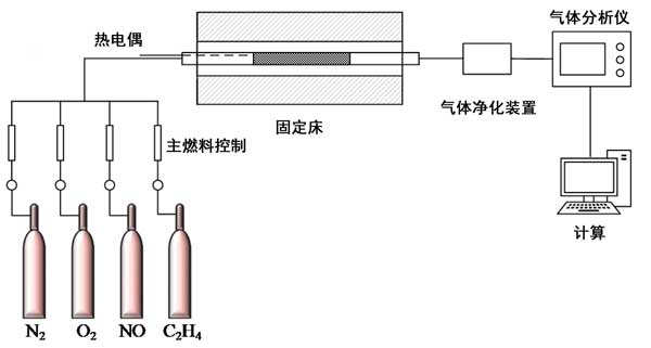 催化測試的實(shí)驗(yàn)裝置如圖1所示。將每種活性炭樣品放入固定床石英管反應(yīng)器中,該反應(yīng)器由溫控爐外部加熱。氣體流速通過質(zhì)量流控制器控制,與模擬氣體混合物調(diào)節(jié)至500ppm NO,500ppm的乙烯,3.0%(體積)Ò 2和N 2為平衡流量,總流量為1500 ml/min。在每個(gè)測試的催化劑溫度達(dá)到穩(wěn)定的設(shè)定點(diǎn)之后,將氣體混合物注入反應(yīng)器中。進(jìn)出氣中NO和NO X的濃度用煙氣分析儀分析。下標(biāo)的進(jìn)和出分別指示入口和出口的濃度。