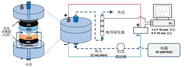 方案1中描述了用于檢查脫鹽性能的膜電容去離子系統(tǒng)。每個電極由作為集電器的石墨,交流電極和IEM組成。將陰離子交換膜和陽離子交換膜分別放在陽極和陰極上。一對電極由厚度為110 µm的尼龍墊片隔開。使用蠕動泵將進料水供應到電解池。處理后的溶液直接流過電導率儀,隨后使用單程模式。除了IEM的存在外,還以與電容去離子中使用的相同配置進行了CDI實驗。使用電池循環(huán)器在1點分別施加電壓10分鐘。在充電步驟中為2 V,在放電步驟中為0V。從第三個循環(huán)獲得數(shù)據(jù),并從至少三個操作中計算出平均值,以實現(xiàn)可重復性。