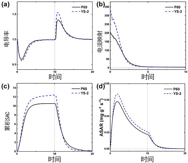 圖2以(a)歸一化電導率曲線表示使用疏水和親水活性炭電極的電容去離子性能。如圖2a所示,在充電步驟期間,與疏水活性炭電極相比,歸一化電導率在親水活性炭電極的情況下顯示出更低和更寬的下降。對于親水活性炭電極,在充電步驟開始時,圖2b中所示的特定電流也顯得較高。圖2的a,b在電容去離子表明更多離子在充電步驟中的初始幾分鐘吸附在親水活性炭電極的表面上。這意味著在親水活性炭電極上可以更快,更高地吸附鹽。可以推斷,由于水分子更容易進入微孔,因此親水活性炭電極上離子的可及表面積大于疏水活性炭電極上的離子的可及表面積。